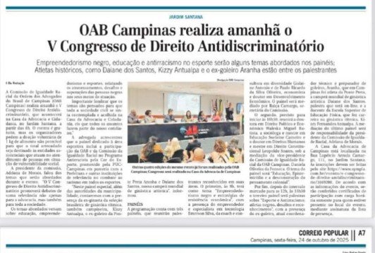 O V Congresso de Direito Antidiscriminatório será realizado em Campinas pela Comissão da Igualdade Racial da OAB Subseção Campinas no dia 25 de outubro dás 8 horas às 17 horas na Casa da Advocacia Campinas na rua Lupércio Arruda Camargo, 111 no Jardim Santana.