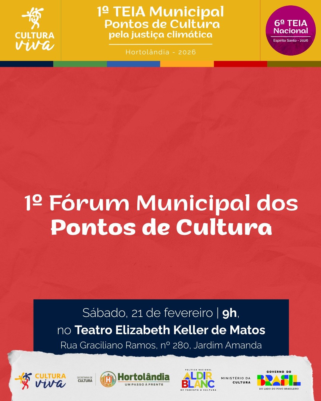 Já no sábado (21/02), será realizado o 1º Fórum Municipal de Pontos de Cultura, às 9h, também no Teatro Elizabeth Keller de Matos.