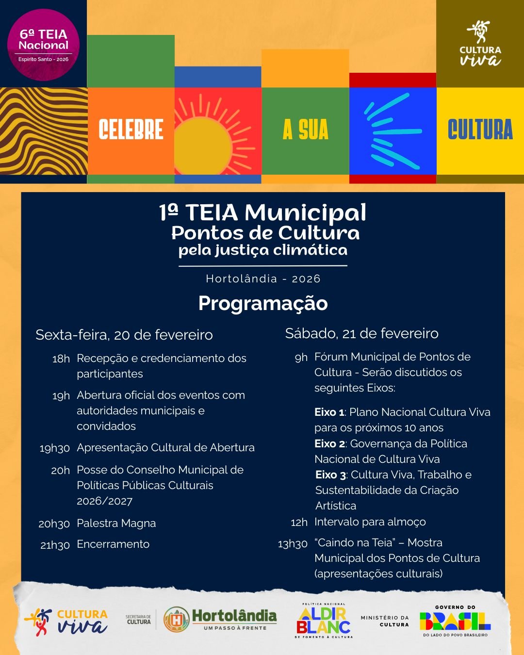 O evento Teia Municipal também acontece em âmbitos estadual e nacional. As discussões na edição municipal serão levadas para a Teia Estadual, que será nos dias 27/02 e 01/03. Já a edição nacional acontecerá de 24 a 29/03, em Aracruz (Espírito Santo).